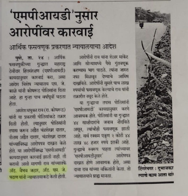 अमरेश मधुकर राव (रा. कोथरूड) यांनी या प्रकरणी पोलिसांकडे तक्रार दिली होती. त्यानुसार पोलिसांनी तपास करून अद्वैत चंद्रशेखर दातार, नीलम अद्वैत दातार, चंद्रशेखर दातार यांच्याविरुद्ध आरोपपत्र दाखल केले होते. या आरोपीविरुद्ध 'एमपीआयडी' कायद्यानुसार कारवाई झाली नाही. ती करावी अशी मागणी राव यांच्यातर्फेअॅड. वैभव जठार, अँड. एम. जे. पठाण यांनी न्यायालयाकडे केली होती.